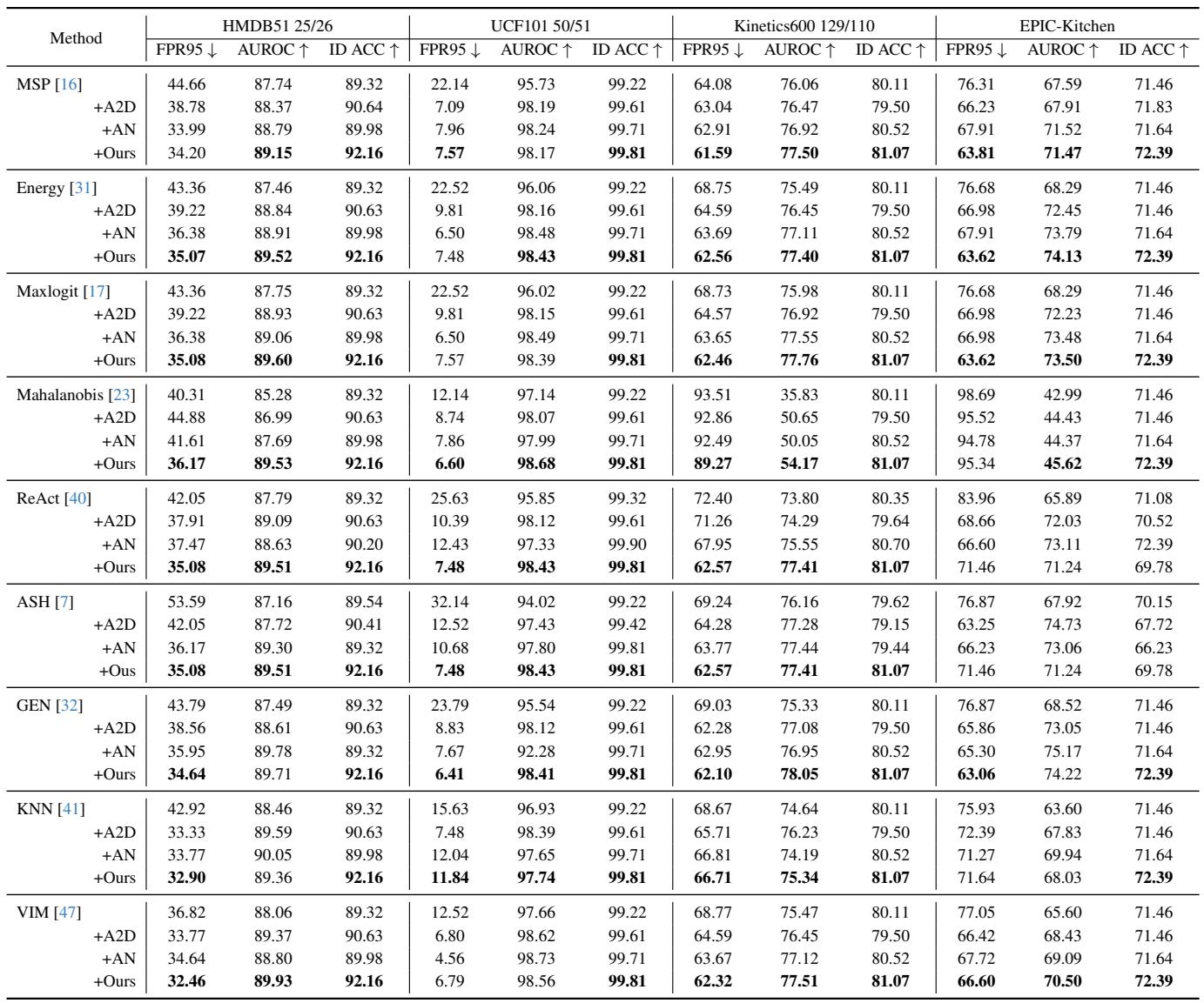 ![The ID accuracy declines after using uniform discrepancy intensification in the SOTA framework [11] (denoted as ‘AN’; the middle bars), and the accuracy improves using our proposed DPU (the right bars). This figure presents the results of MSP and ReAct in Far-OOD detection using HMDB51 as the ID dataset.](/en/paper/2411.08227/images/028.jpg#center)